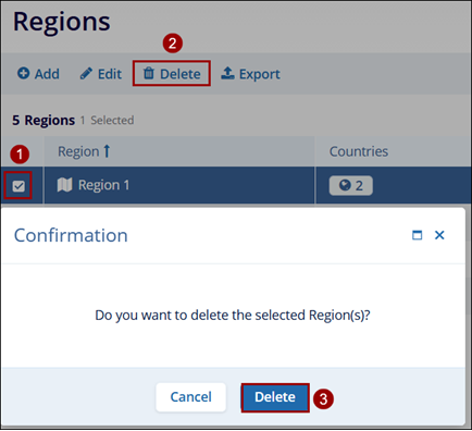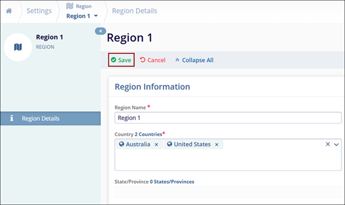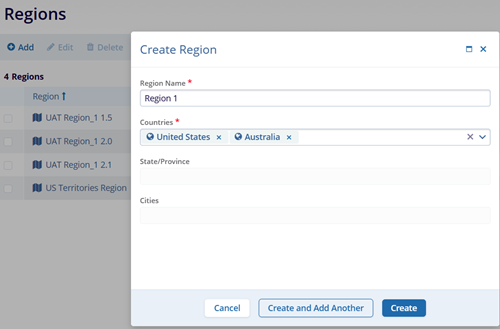 - On the Create Region screen, mandatorily enter the Region Name and Countries