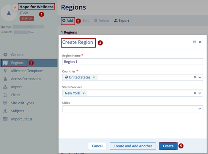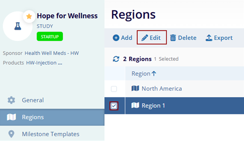 Within the Regions settings, users can add, edit, delete, and export regions created at the study level.