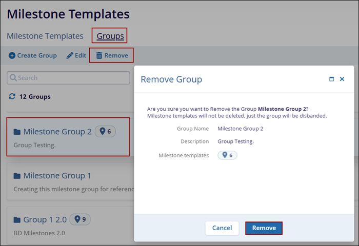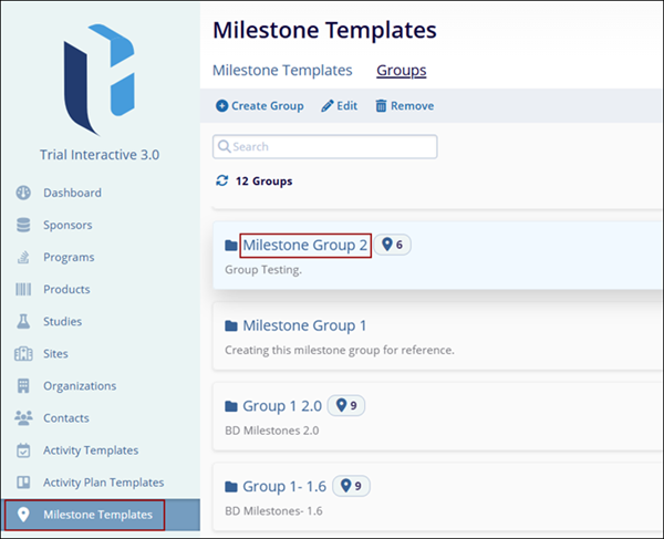 - From the left-hand navigation links, select Milestone Templates > Groups