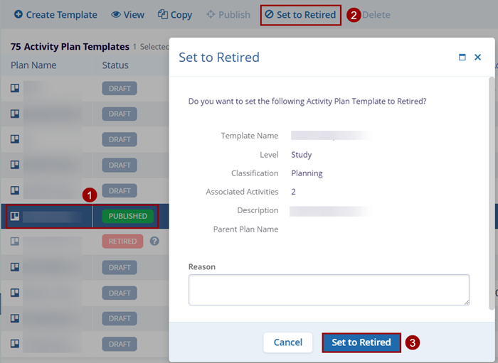 Note: Only Activity Plan Templates with Published status can be retired.
