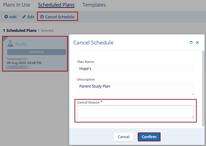 - On the Cancel Schedule screen, mandatorily enter a reason and click on the
