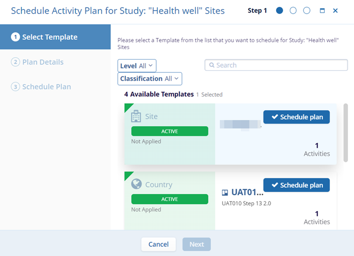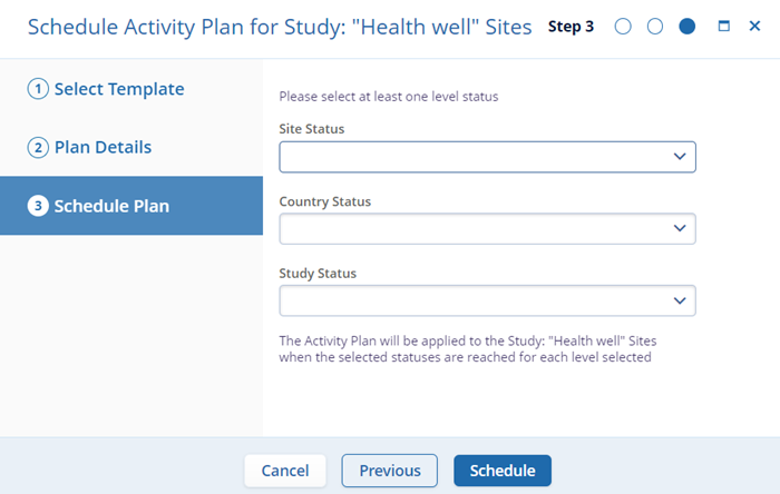 Schedule Plan: On the Schedule Plan screen enter the Stie, Country, and Study