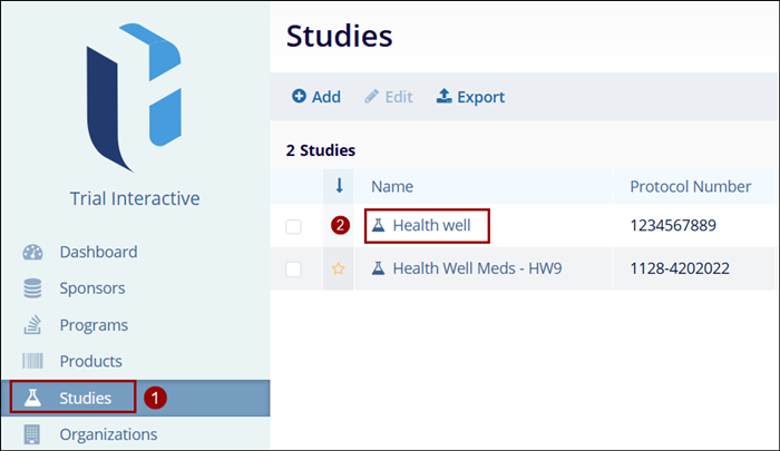 - Select a study by clicking on the study’s name.