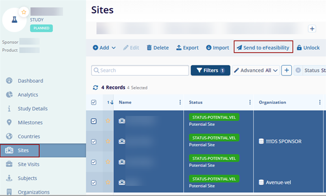 Users can share Potential sites list from CTMS to eFeasibility, from the Sites grid within a study profile, ensuring the reduction of duplicate efforts for site entries across multiple applications.