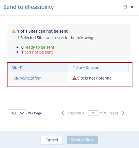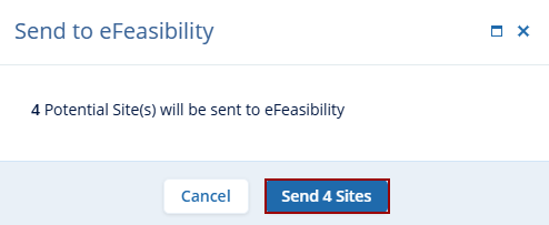 Important: The ‘Send to eFeasibility’ dialog box displays the failure message incase the selected sites does not match the requirements.