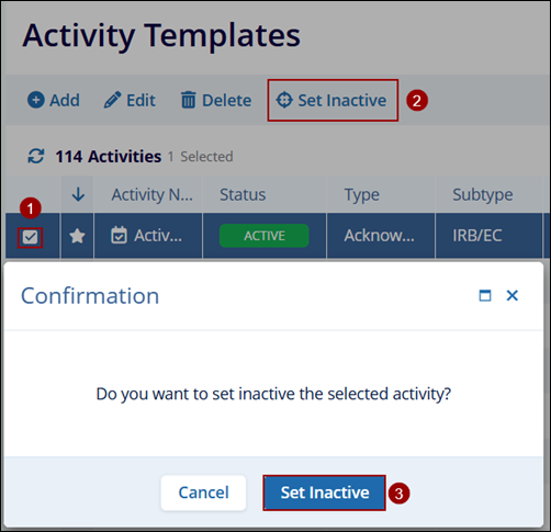 - Navigate to the activity name to edit and click the checkbox of the activity name with an Active status.