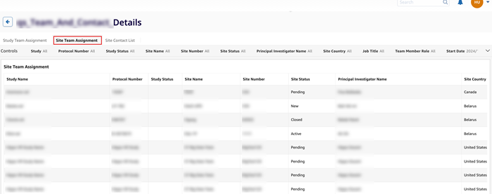 The Site Team Assignment dashboard offers comprehensive insights into site team assignments across studies.