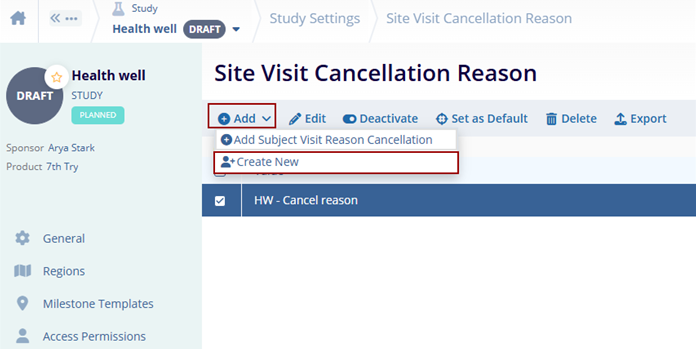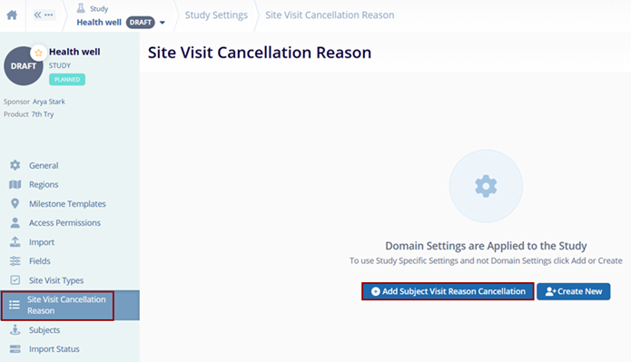 - On the Study Settings screen, click on the Site Visit Cancellation Reason option from the left-hand navigation pane.