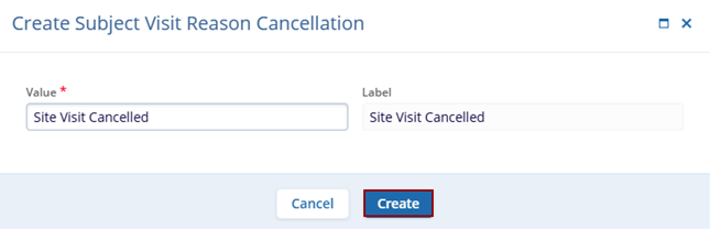 - On the Create Subject Visit Reason Cancellation modal, specify the value and click