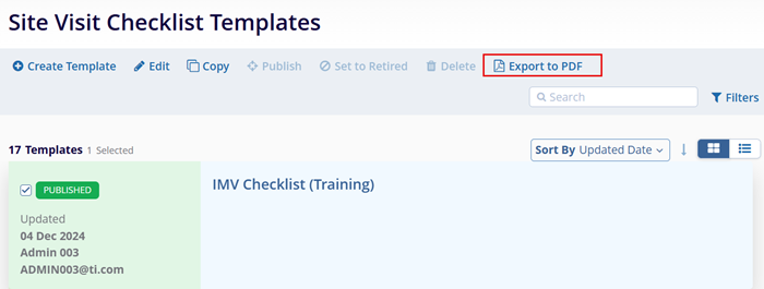 - Select a Checklist Template and click on the Export to PDF