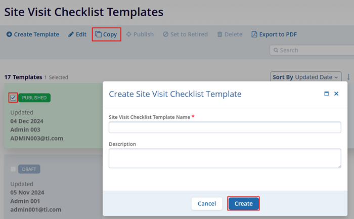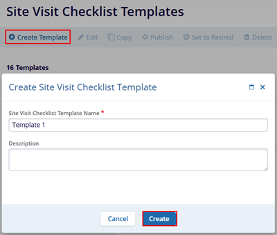 - On the ‘Create Site Visit Checklist Template enter the details and click on the Create button.