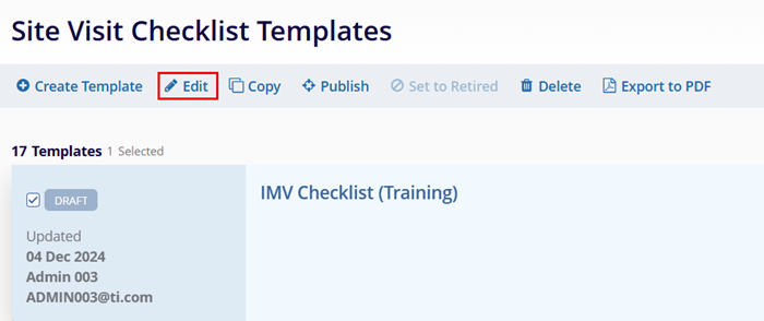 Note: Once a Site Visit Checklist has been retired, it cannot be re-published. It is recommended to copy the checklist and publish the new copy to use the checklist again.