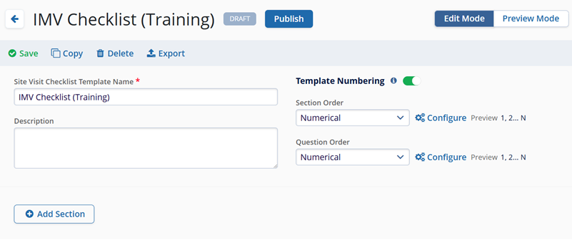 - Using the toggle switch, indicate if the sections and questions in the checklist should be ordered and, if so, whether the ordering should be alphabetical or numerical.