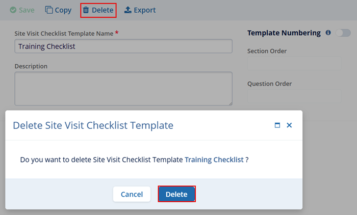- On the ‘Delete Site Visit Checklist Template’ confirmation popup, click on the