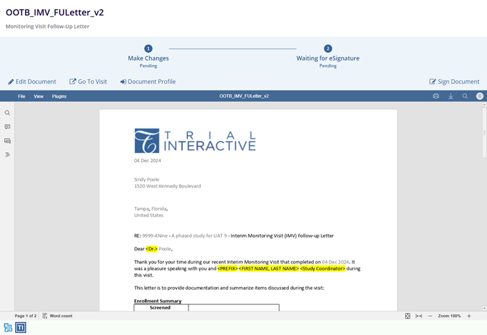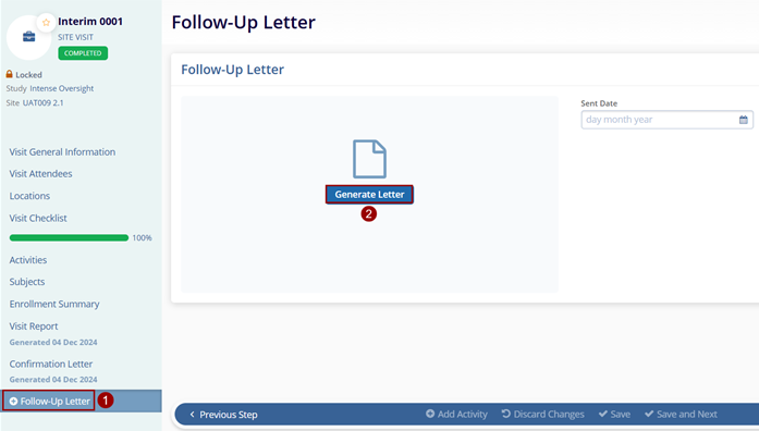 - CRAs can generate a follow-up letter immediately after a site visit is created and specify any ‘Sent Date’.