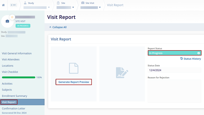 - Navigate to the Site Visit General Information screen by following the steps detailed in the Site Visit Navigation section and click on the Visit Report link.