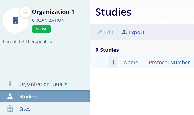 - On the Organization Details screen, click on the Studies from the left-hand navigation links.