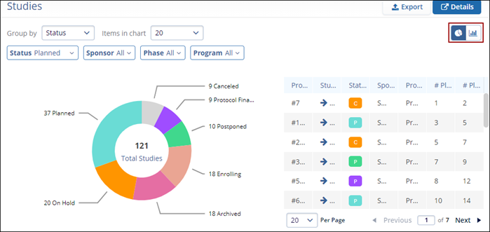 The Studies dashlet provides a visual and detailed overview of the study portfolio. It features a customizable chart, either pie or bar, alongside a study list displayed in a clear table format, offering both high-level insights and granular data.