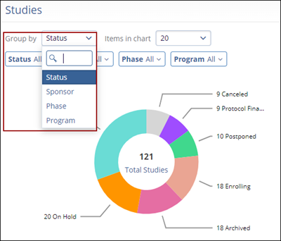 - Group and Display: Click on Group by to select the preferred grouping criteria (e.g., by status, phase, sponsor, or program). The chart will automatically update based on the selected grouping. Users can also click on the number of items to control how many categories are displayed in the chart.