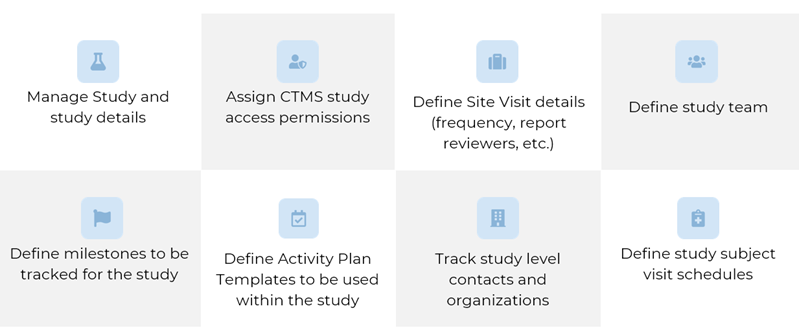 - Study Administration: Create and maintain Study records, including associated Countries and Sites.