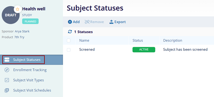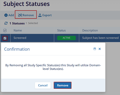 - On the Subject Statuses screen, select the records and click on the Remove button from the top menu bar.