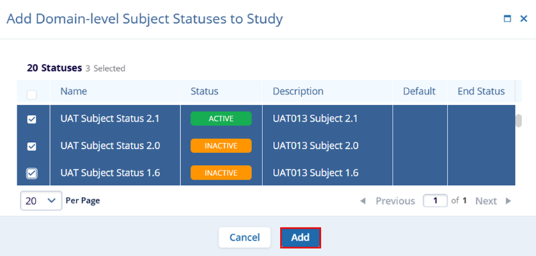 - On the Add Domain-level Subject Statuses to Study screen, select the required
