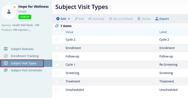 - Click on the Subject Visit Types and Add, Edit, Delete, Set as Default,