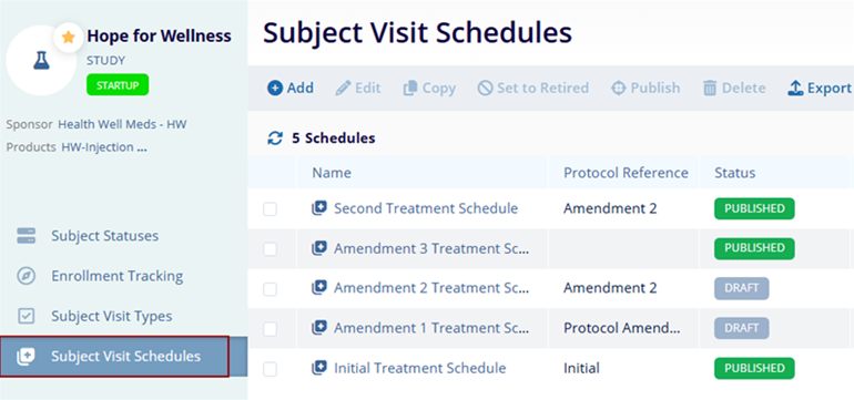 - Click on the Subject Visit Schedules and Add, Edit, Copy, Set to Retired,
