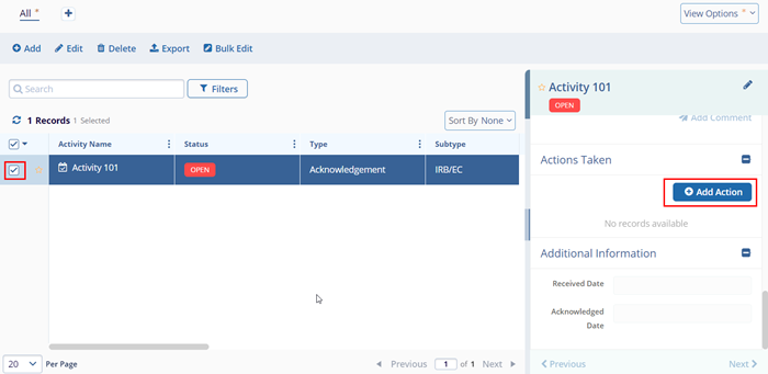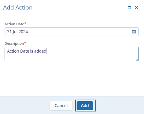 - On the quick view panel, navigate to the Actions Taken section and click on +Add