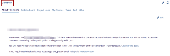 The About This Room tab provides a welcome message and important information regarding the use of the room. This space can be customized to include study details, access requirements, and relevant support information. It mentions the need for Adobe Acrobat Reader for viewing certain documents and includes a link to download it. Users with Administrator or Manager roles can edit this content to ensure that all participants have up-to-date information and resources.