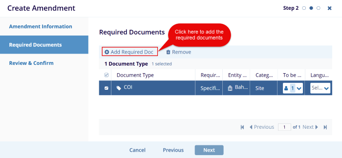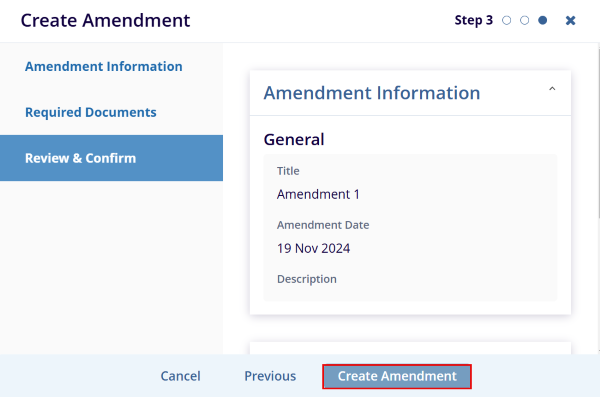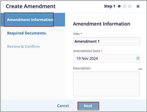- On the Create Amendment window, enter the necessary details in Step 1: Amendment