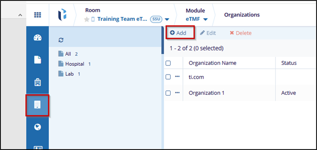 - In the eTMF module, go to the sidebar and click on the Organizations modal.