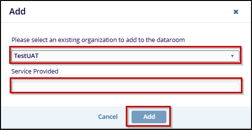 - Within the Add window, select an existing organization from the drop-down list labelled - Please select an existing organization to add to the data room.