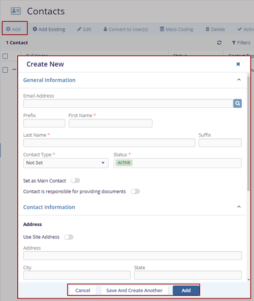 - Click Add to save the contact, or click Save and Create Another to save the current contact and add a new one, and Cancel to discard the changes.