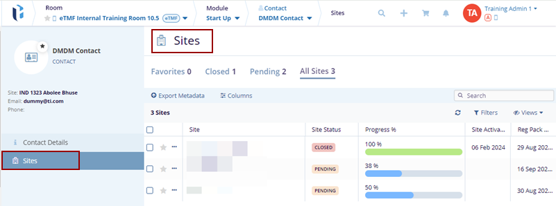 - Click on the Sites on the left side in the index panel. The Sites page is