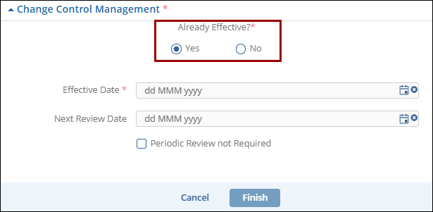- Navigate to the Change Control Management section and select either Yes or No in the Already Effective* section.