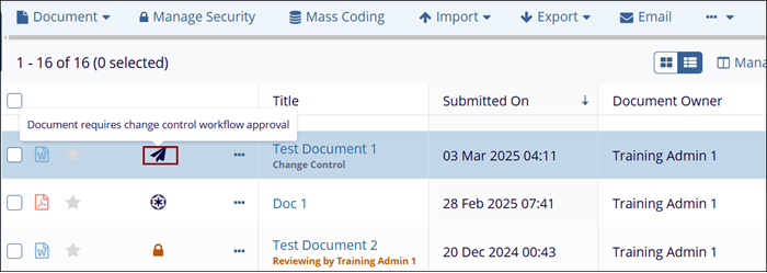 - If Start Approval Workflow = Yes, the document is highlighted with a paper plane icon indicating the document requires a change control approval workflow.