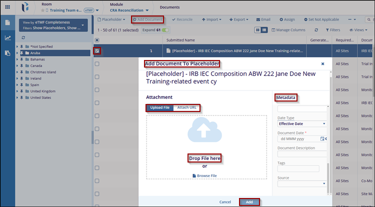 The Add Document refers to uploading a document or attaching a URL, such as an eTMF (Electronic Trial Master File) document. These documents may include queries, audits, or any other files that need to be added to placeholder.