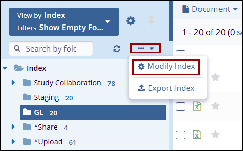 Administrator-level users can add new folders to the index structure of the documents module from the Index pane. There is a three-dot menu under the view selector menu.