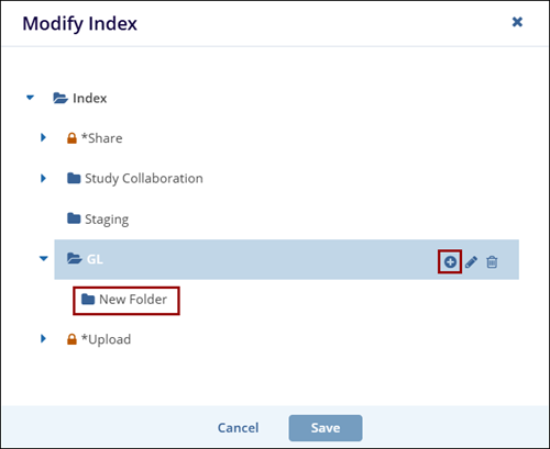 Hover over the parent folder, or hover over the index to create a new sub-folder, and click the + icon to add a new folder.