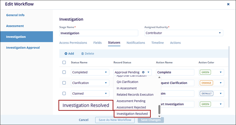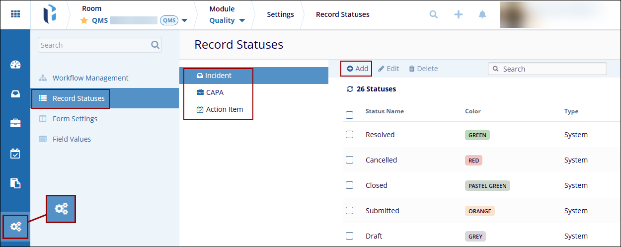 - Select either Incident, CAPA, or Action Item to add record statuses to the respective forms.