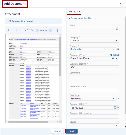 - Click the Add Doc button displayed in the top menu bar, this opens the Add Document popup window.