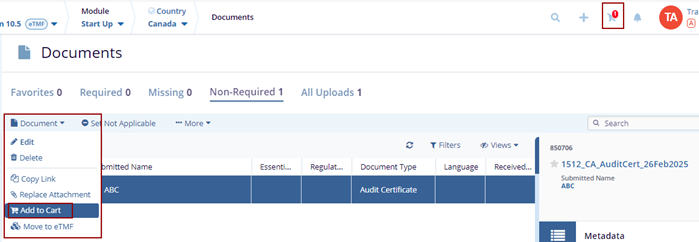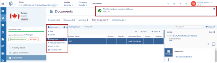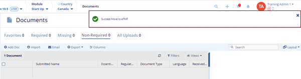 - The Success Move to eTMF notification message is displayed on the top right of the screen.
