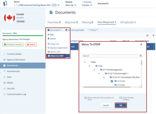 - Click the Move To eTMF option. The Move To eTMF pop-up window is displayed with the list of the available folders in eTMF.