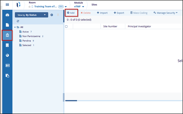 - Click on the Sites modal from the left-hand navigation pane within the eTMF module.