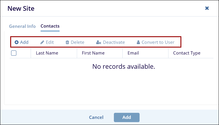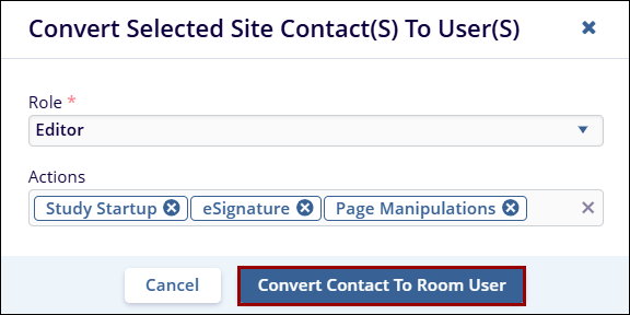 - On the Convert Select Site Contacts screen, provide a role and the