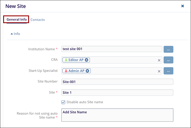 - Site*: Mandatorily enter the site name if Disable auto Site Name is disabled.