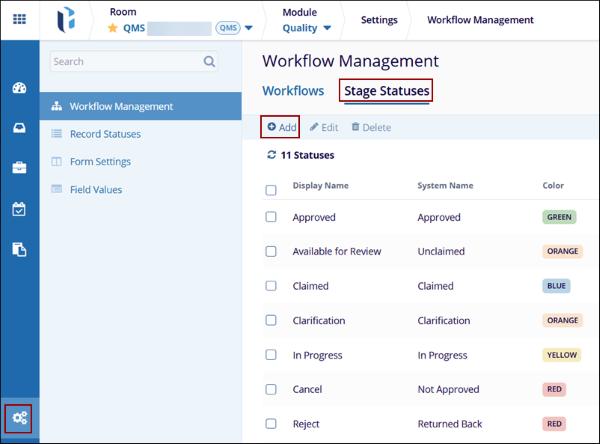 - From the Quality module, click on the Settings menu > Workflow Management > Stage Statuses tab.