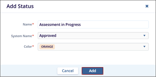 - On the Add Status dialog box, mandatorily add the following details and click on the
