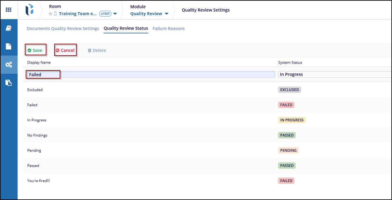 button on the Quality Review Status tab. - Once clicked on the Add button, the fields under the Display Name and System Status are available to edit.